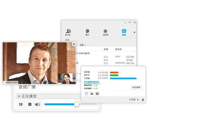 举行一次包含视频、屏幕共享、问答、投票和聊天的出色交互式演示。人们从所有平台轻松加入。