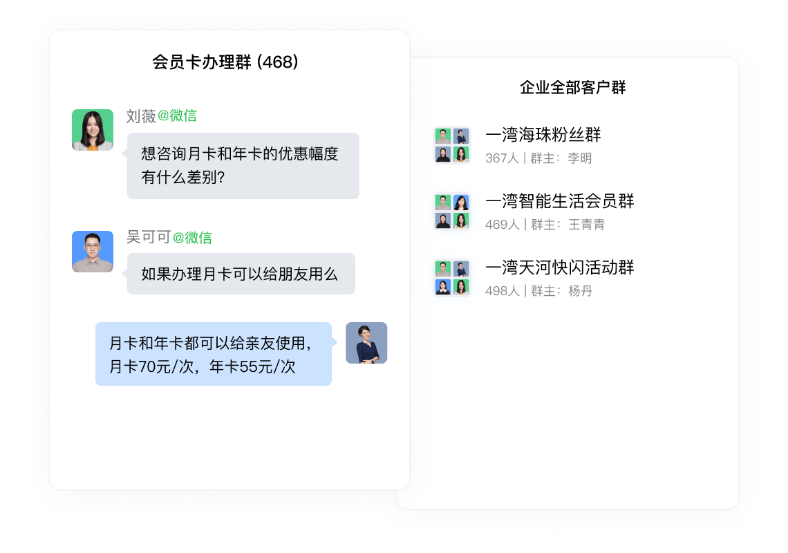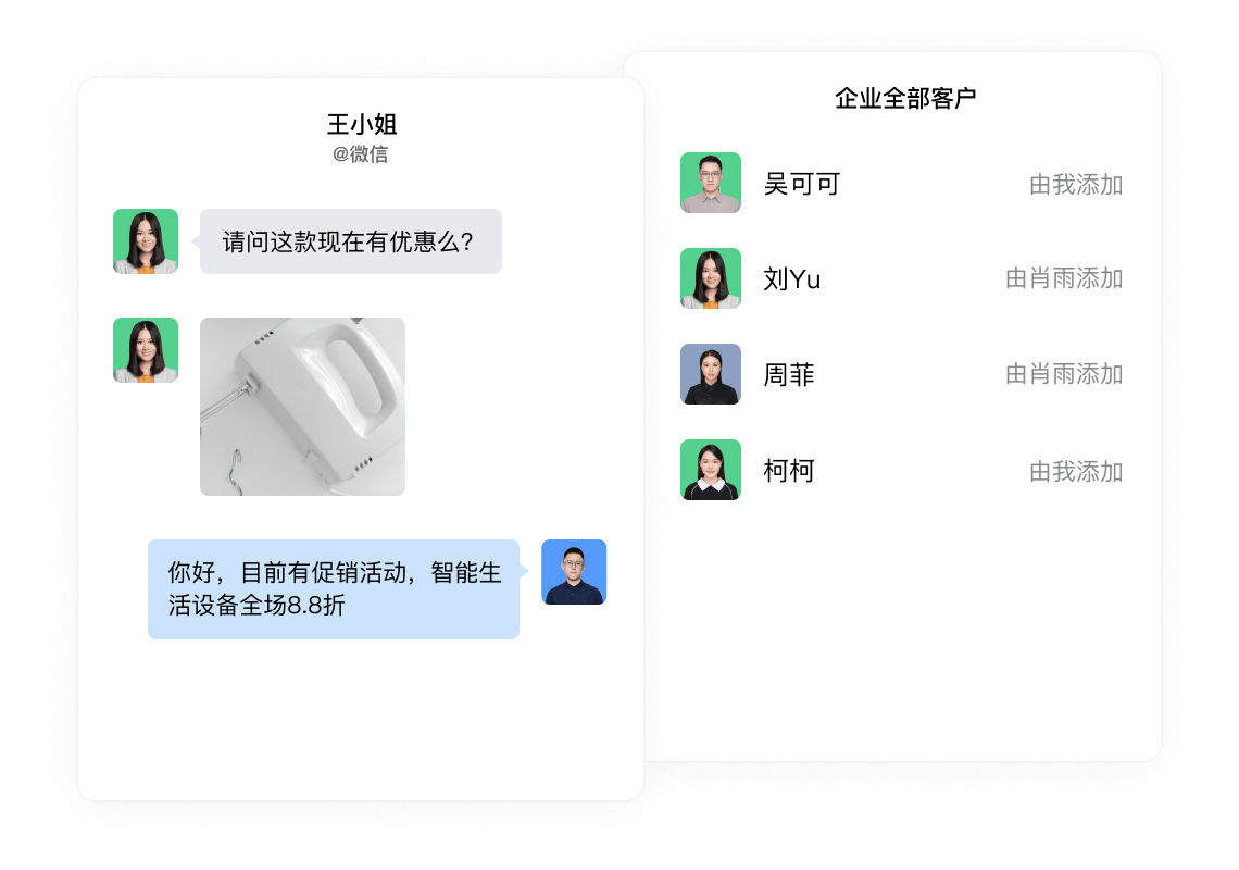 添加客户的微信为好友,通过单聊或群聊为客户提供服务。企业可查看并管理成员添加的微信客户,对离职成员的客户再分配。